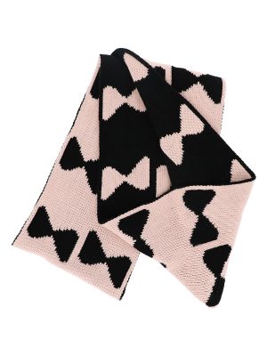 This stylish infinity scarf features a bow-like pattern throughout. Comprised of knit acrylic yarns for a cozy feel–perfect for the winter and fall seasons. Loop around your neck for a classic look, or drape around your shoulders for versatile wear. Features knitted shades of black and pink throughout, with inverted colors on the opposite side.