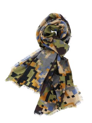 Add some pattern to your look with this colorful pixelated camouflage oblong scarf! Cut in a rectangular shape to create endless wearable possibilities. Shades of green, orange, black, blues and yellow can be seen throughout the pattern of this scarf.